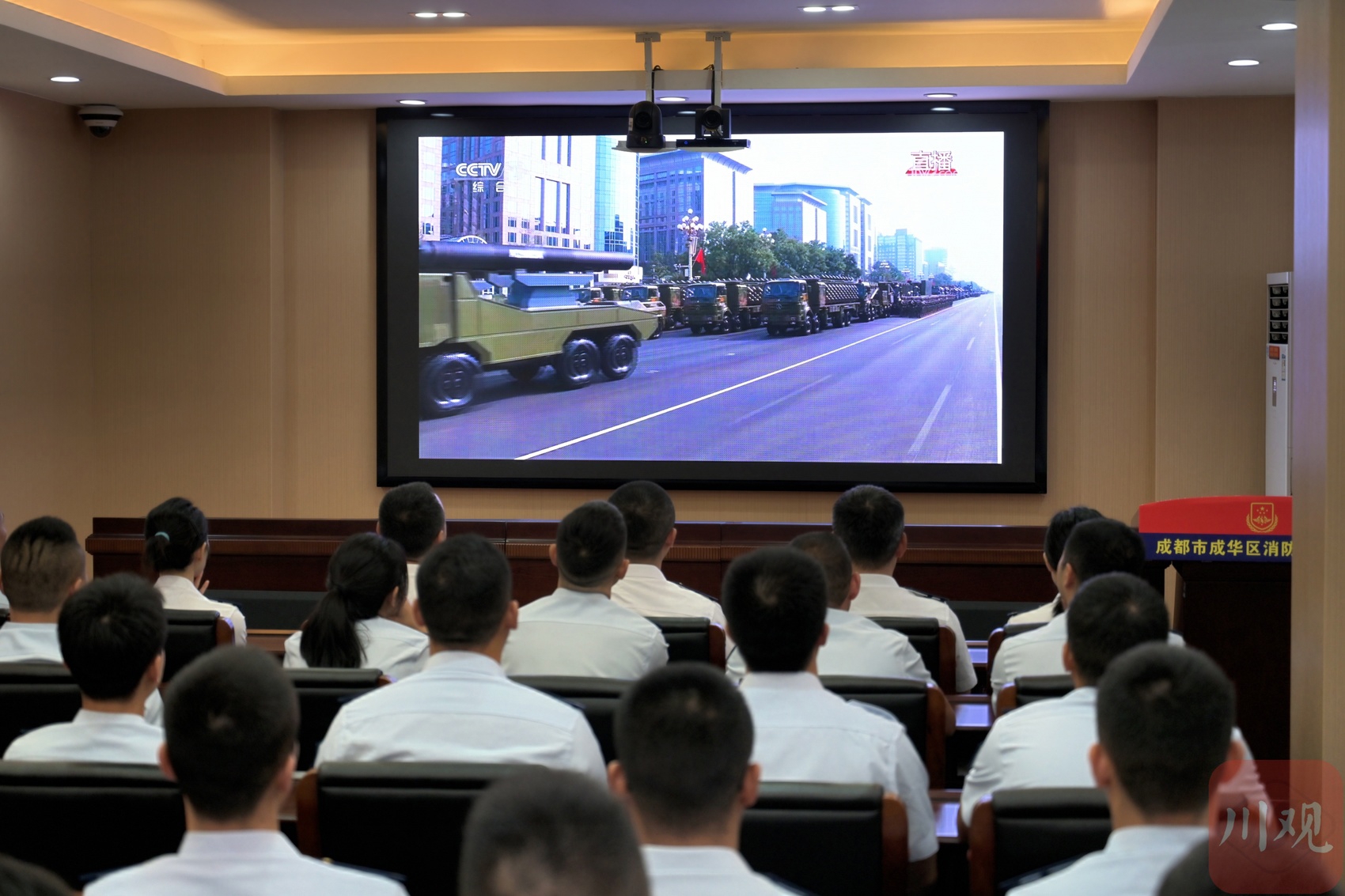 9月3日,纪念中国人民抗日战争暨世界反法西斯战争胜利80周年大会在北京天安门广场隆重举行。成都市成华区消防救援大队组织消防救援人员集中观看九三阅兵直播。