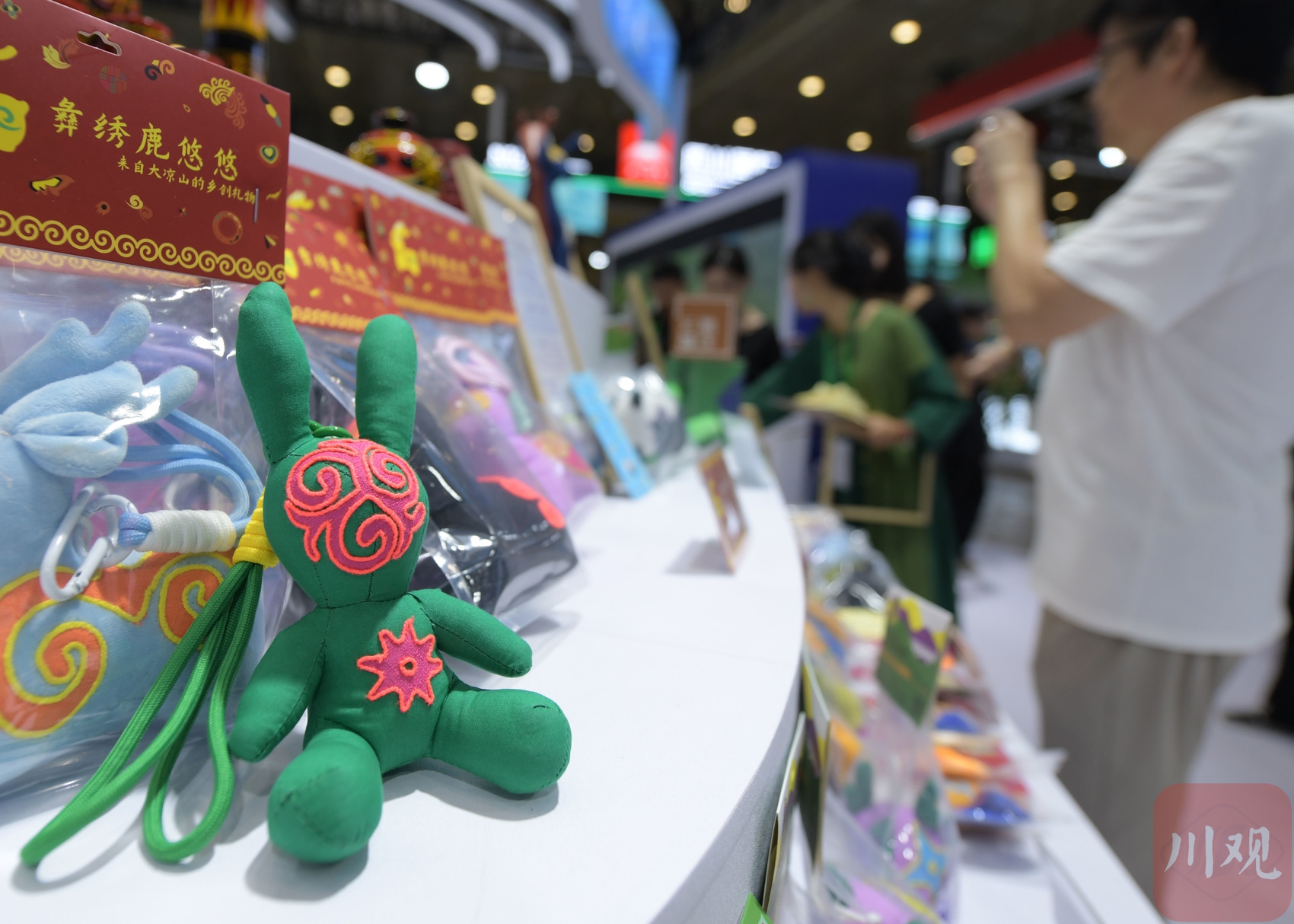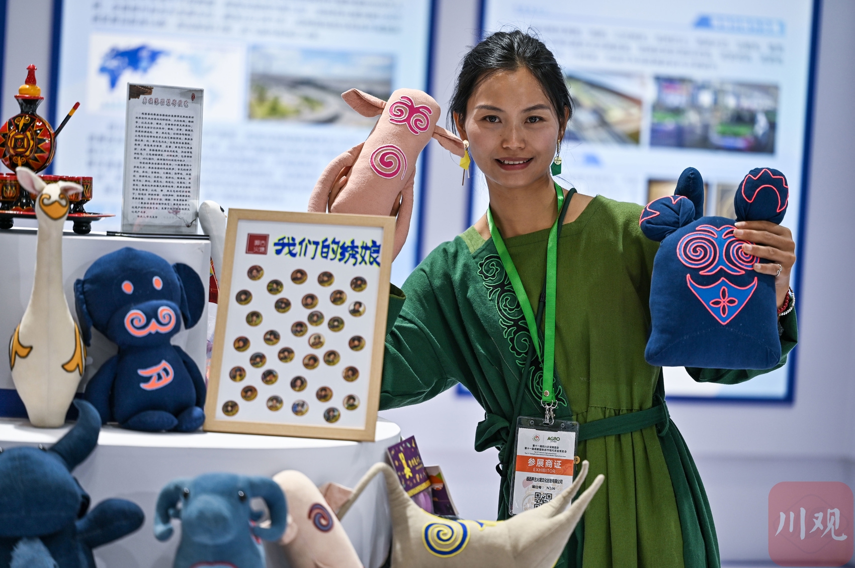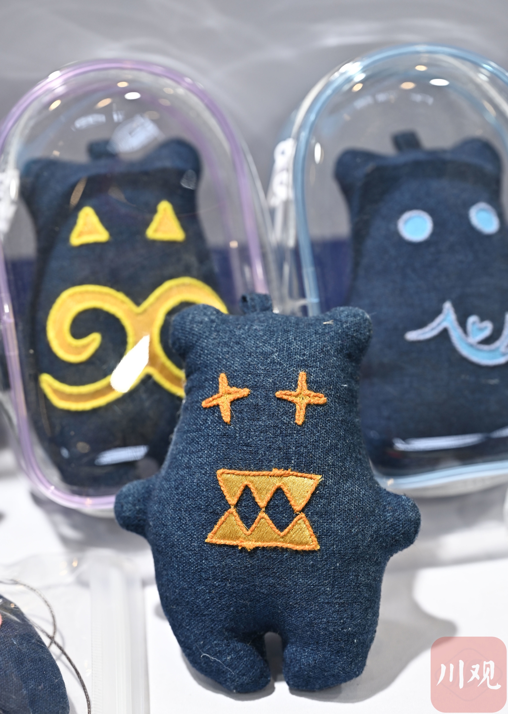 9月5日,一批造型可爱的彝绣玩偶亮相农博会展场,这些好看又好玩的玩偶很快吸引了观众的目光。“这是我们的‘鹅美丽’ 、‘兔小月’,” 凉山州越西县呷古村火塘乡创中心主理人卢亚现场介绍,“这是我们将呷古彝绣的贴布绣、盘线绣、挑花等技法,将羊角纹、火纹、索玛花纹等设计和手工缝制到时下受欢迎的徽章、挎包、玩偶上,联结古今,将传统非遗赋予新的生命力,打造成为年轻人喜爱的产品。”