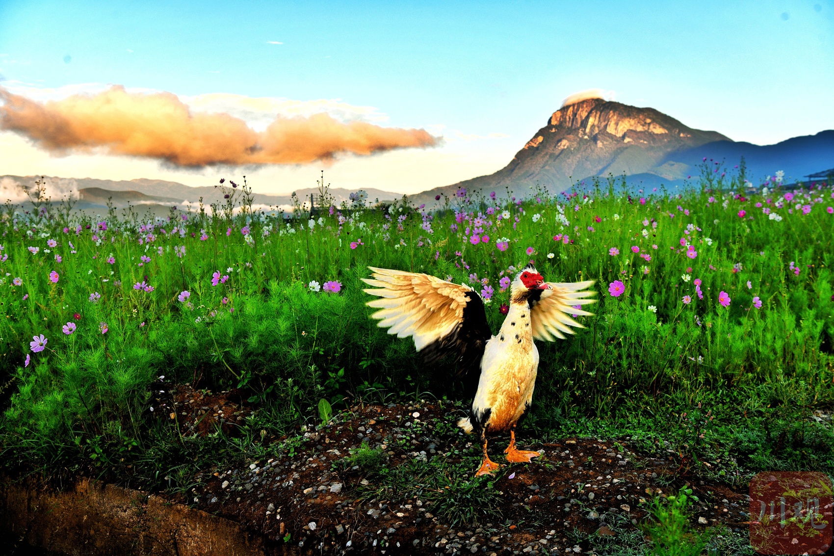 清晨,情人牧场里的格桑花与鹅。