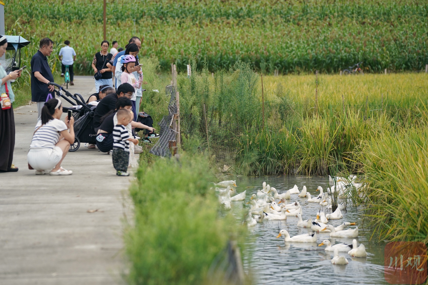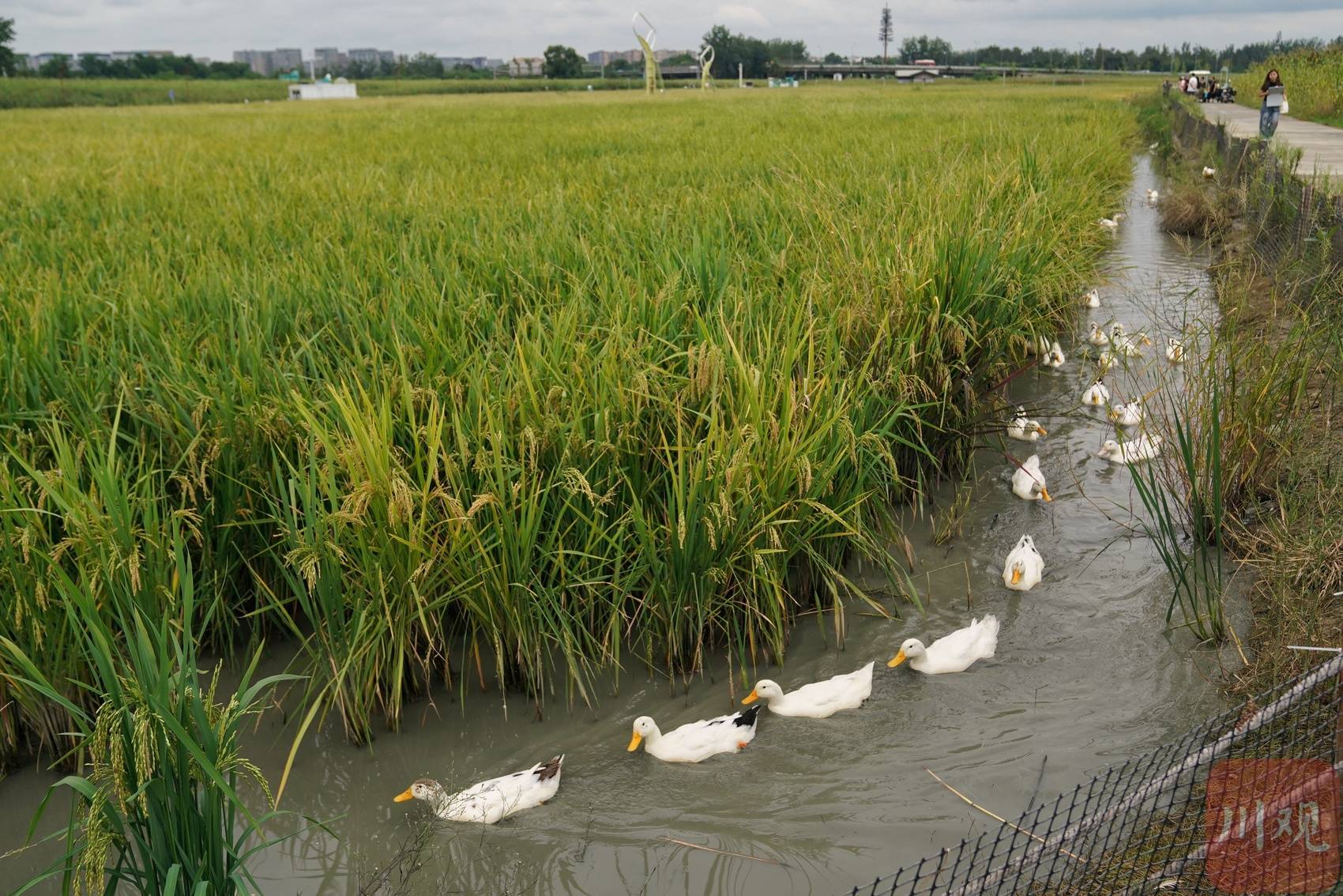 市民在田边的道路上欣赏城市中“鸭稻共生”的田园风景