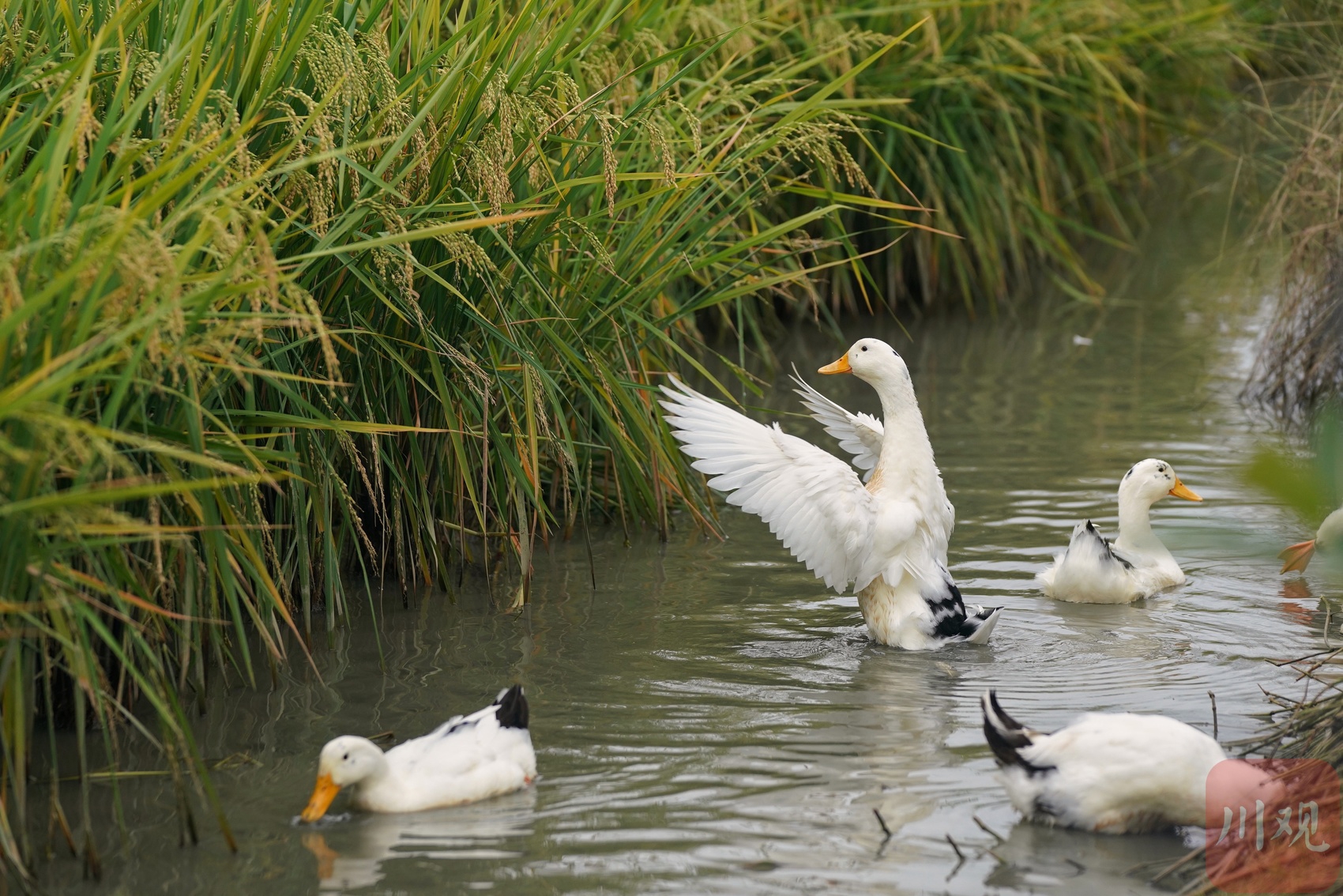 憨态可掬的鸭子在水稻田中浮水嬉戏