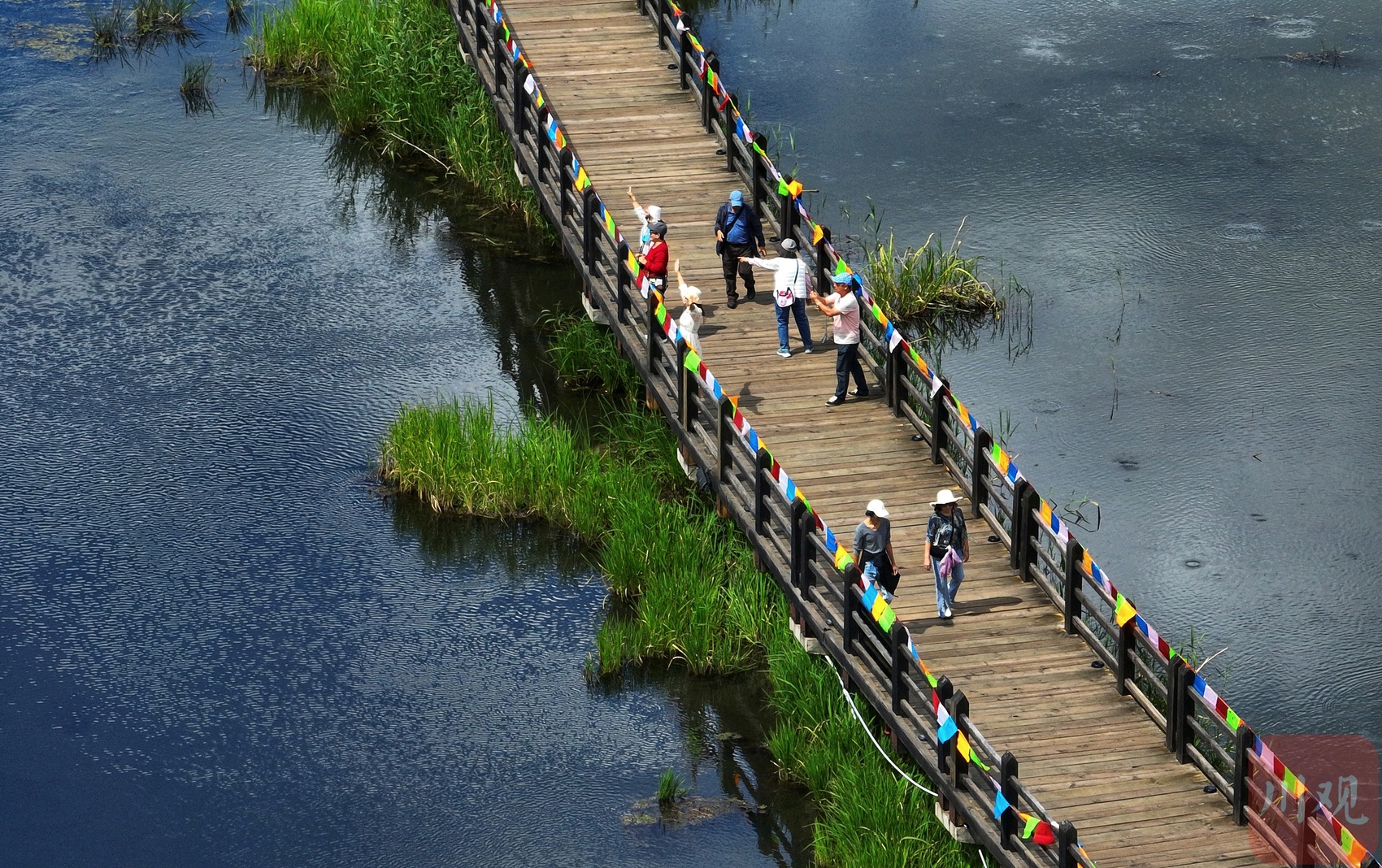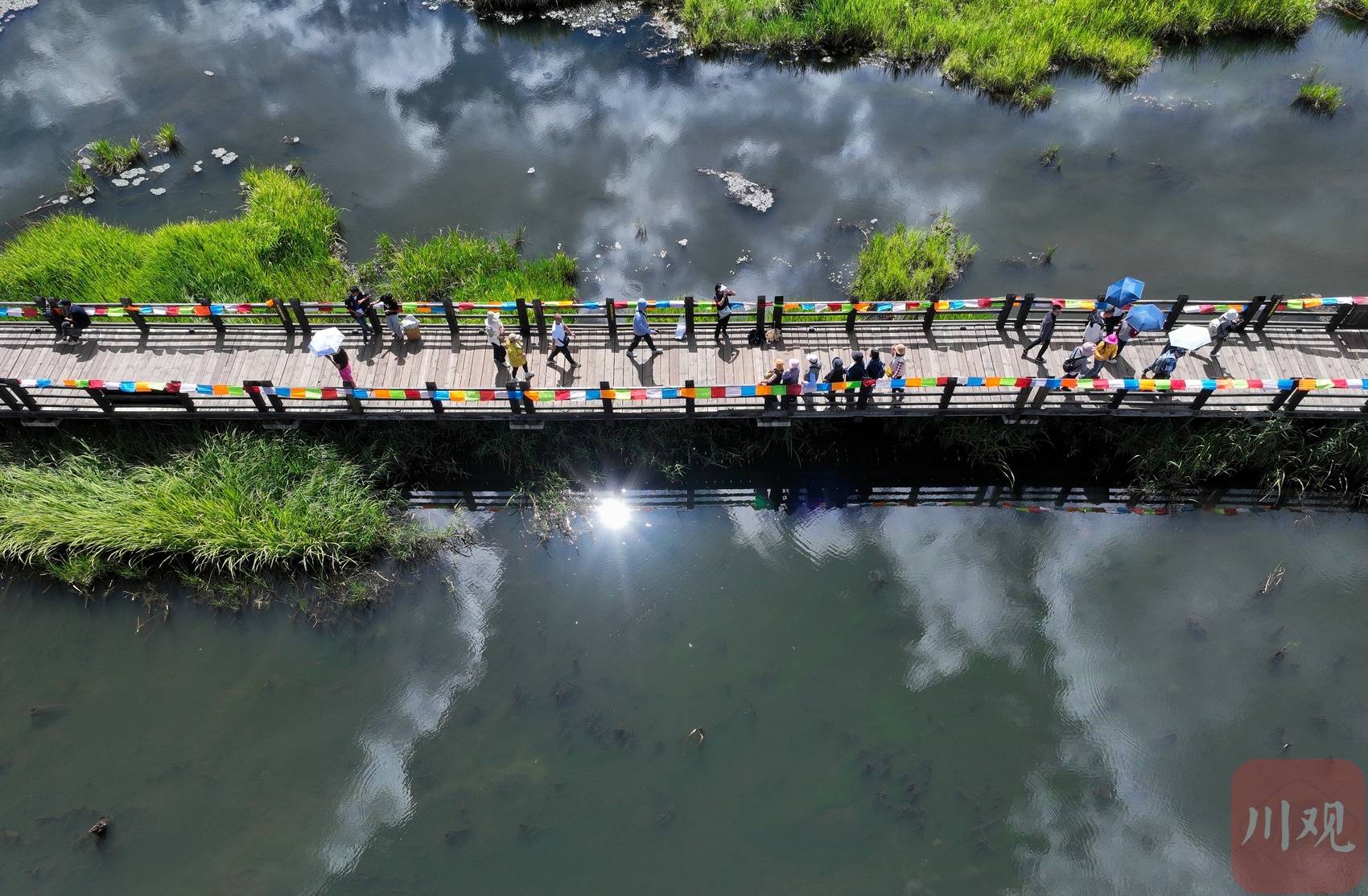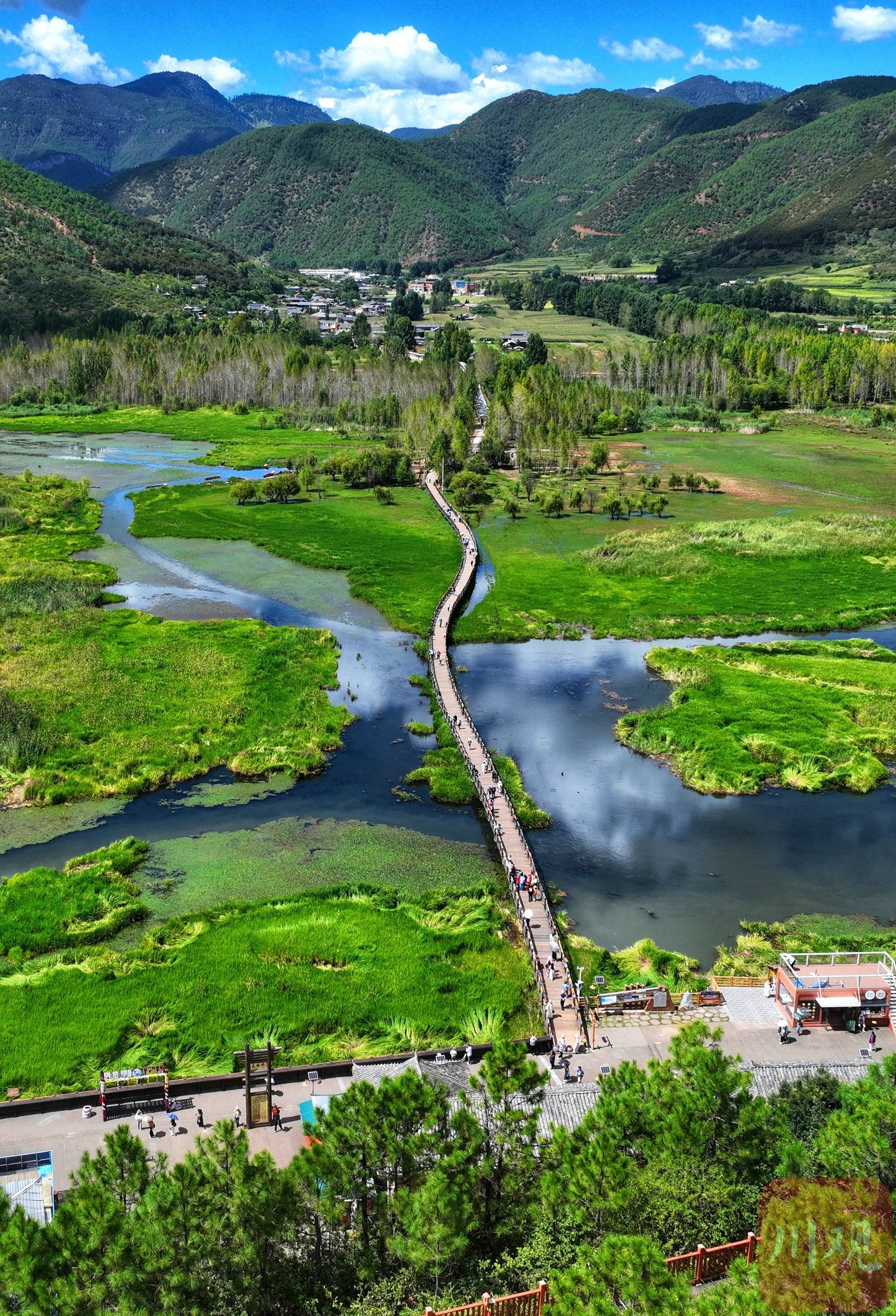 走在桥上,脚下的翠绿色草海正悄然随秋意变换——夏日常见的浓绿慢慢褪去,转而染上浅绿,间或点缀几缕微黄。灰褐色的木桥蜿蜒穿梭于湿地间,桥身与水中浮动的白云倒影交叠,勾勒出静谧又诗意的景致。游客们或漫步赏景,或驻足拍照,在水天一色的自然意境里,静静感受摩梭文化的独特韵味。