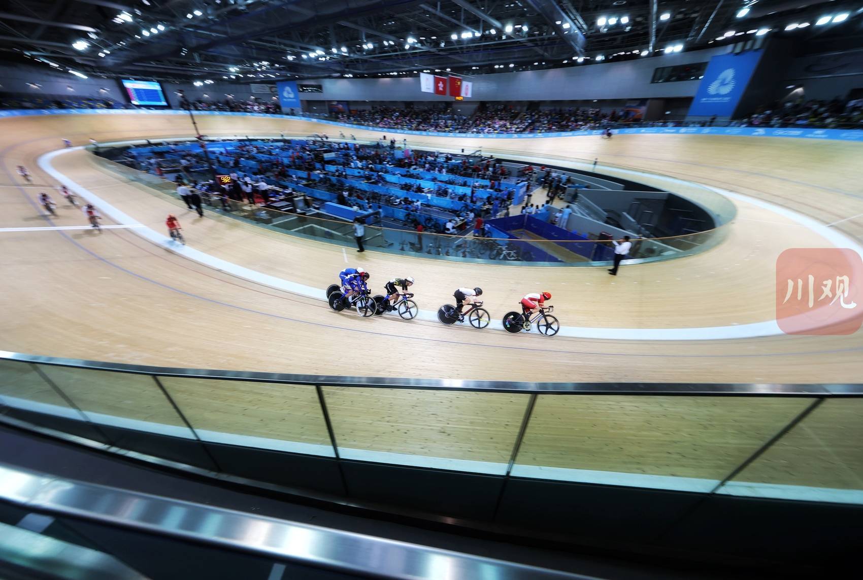 香港单车馆是全运会自行车赛场地,图为麦迪逊比赛中,戴红帽为四川队。