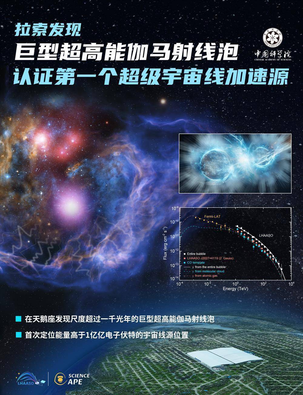 位于甘孜稻城的高海拔宇宙线观测站拉索在天鹅座恒星形成区发现了一个巨型超高能伽马射线泡状结构,历史上首次找到能量高于1亿亿电子伏的宇宙线的起源天体。该成果于2月26日以封面文章的形式在《Science Bulletin》(《科学通报》)上正式发表。
