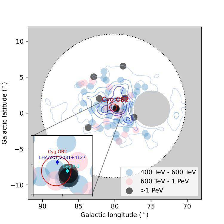 因此,这表明泡内部存在超级宇宙线加速器,源源不断地产生能量至少达到2亿亿电子伏的高能宇宙线粒子,并注入到星际空间。这些高能宇宙线与星际空间中的气体物质发生碰撞产生伽马光子,光子的数目与周围气体的分布呈现清晰的关联,而位于泡中心附近的大质量恒星星团(Cygnus OB2星协)则是超级宇宙线加速器最可能的对应天体。