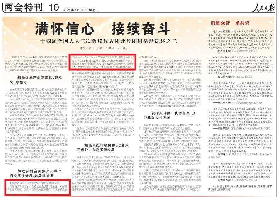 会上,多位代表先后发言,表示完全赞成全国人大常委会工作报告、最高人民法院工作报告、最高人民检察院工作报告,并结合实际提出意见建议。四川省委书记、省人大常委会主任王晓晖代表说,四川聚焦实施“两大战略”,扎实推进成渝地区双城经济圈建设这个国家重大战略和“四化同步、城乡融合、五区共兴”这个省委发展战略,推动新时代新征程四川现代化建设迈出坚实步伐。“我们牢牢把握高质量发展这个首要任务,坚持把发展经济的着力点放在实体经济上,加快构建富有四川特色和优势的现代化产业体系,大力推进创新驱动发展。”王晓晖说,四川坚持以党的政治建设为统领全面推进党的各项建设,良好政治生态不断巩固发展,进一步调动了全省党员干部干事创业的积极性主动性创造性,汇聚形成了共同推进事业发展的强大合力。