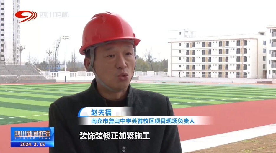 南充市营山中学芙蓉校区项目现场负责人 赵天福:目前项目主体已全部封顶,装饰装修正加紧施工,保证校园9月投入使用。