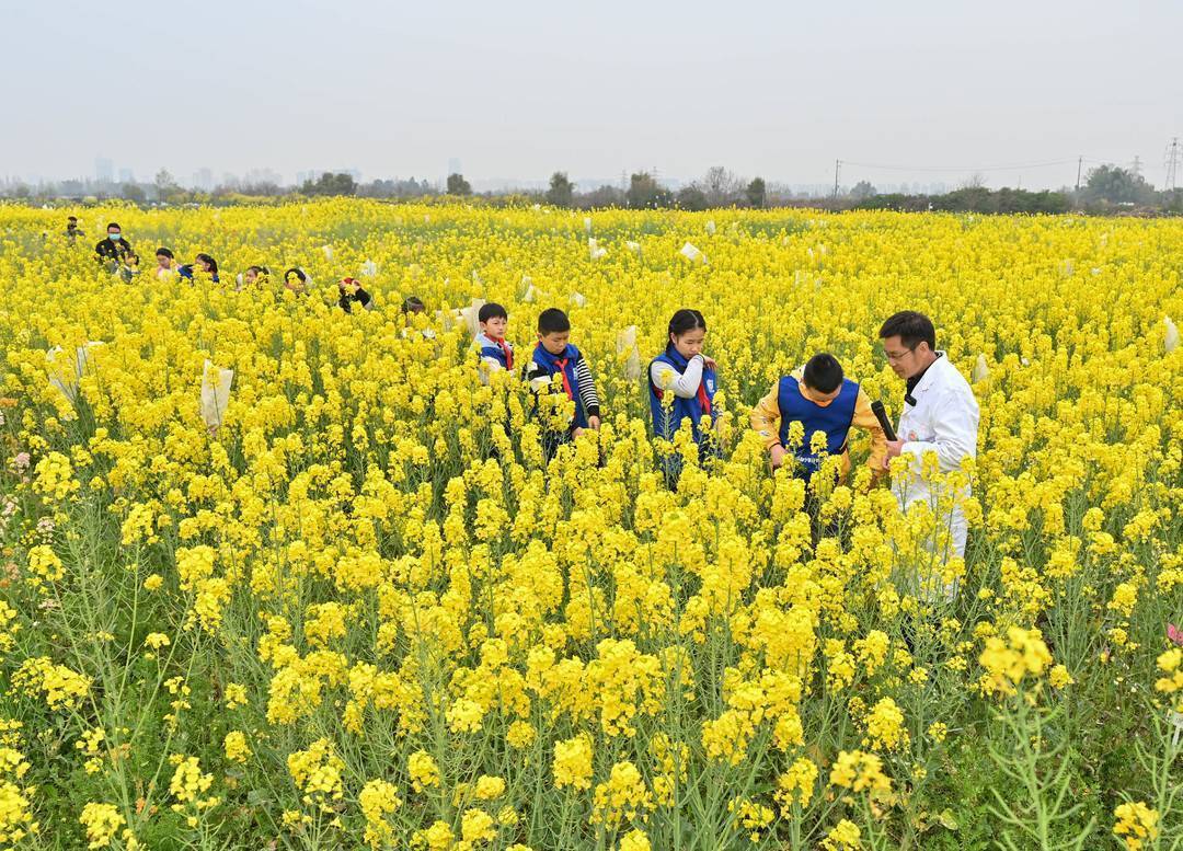 一群小学生跟着成都“名师一堂课”文明实践示范宣讲活动来到油菜花试验种植基地 摄影:周娜