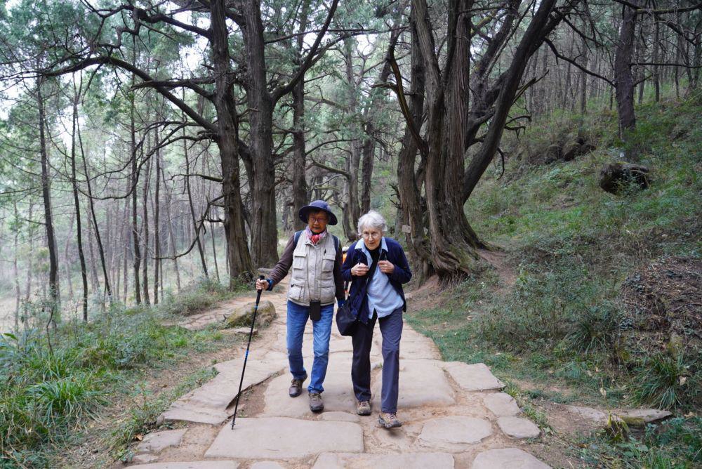 3月17日,81岁的美国女士贾和普(右)和同行美国朋友在古蜀道上徒步。新华社发