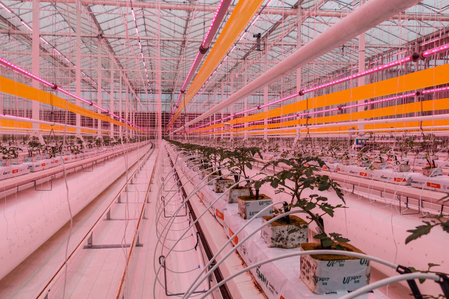 栽培槽、暖通轨道兼容管、植株间暖通管、LED补光……在该温室内,一行行碧绿的小番茄植株藤蔓盘旋而上,高达3米,如同一个个“固碳标兵”。温室控制室的电脑上,气温、相对湿度、二氧化碳浓度等数值一目了然。