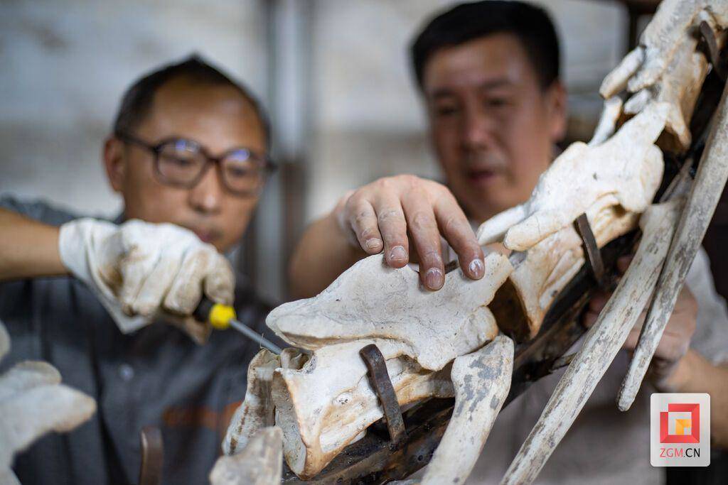 在自贡恐龙博物馆,胡永忠和同事们修复的各种恐龙化石,都是无价之宝。“几亿年前的生命,经过我们的修复呈现给几亿年后的观众,这种感觉非常奇妙!”胡永忠说,如果想要修复一块化石,需要在显微镜下观察化石的结构和形态,再用笔去慢慢修复,剥去上面的围岩,让化石的骨骼结构逐渐显现出来。馆里一名前辈同事曾耗时3年才修复劳氏灵龙化石,自己自工作以来已经和同事修复与复原了20多具恐龙骨架。
