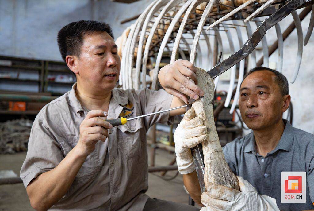 “嘭嘭嘭……哒哒哒……”在自贡市大安区大山铺镇的一个不起眼的院落里,每天都会传出各式工具的合奏曲,这便是恐龙馆化石标本修复与复原工作的场所。“这是甘氏四川龙头部的化石标本,在复原时要采用从外到内、从高到低的原则对牙齿进行复原。”自贡恐龙博物馆陈列部负责人胡永忠身着工作服,脸庞被阳光晒得黝黑,汗水浸湿了额头,依旧一丝不苟地向两名晚辈嘱咐道。
