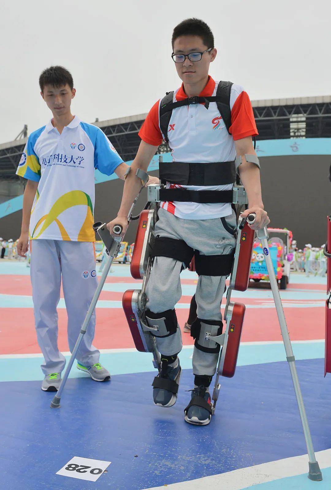 ▲2015年9月12日四川省成都市双流区,火炬手林寒佩戴外骨骼机器人行走。