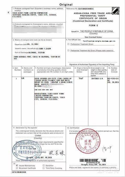 近日,宜宾海丝特纤维有限公司申领的《中国—东盟自贸协定》原产地证书自助打印成功,拿到了带有海关电子签章和防伪标志的原产地证书。这是宜宾关区首份企业自助打印出口越南的《中国—东盟自贸协定》原产地证书。凭借此份原产地证书,该公司出口的3.2万美元货物在越南清关时享受了零关税待遇,直接获得关税优惠约1.2万元人民币。