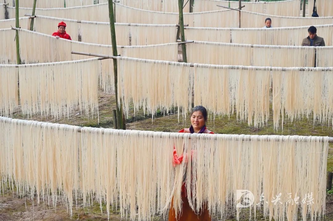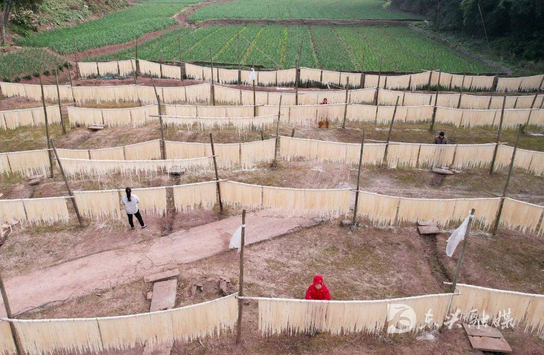 近日,在内江市东兴区顺河镇见龙村,村民们正忙着晾晒刚刚制成的粉条,一排排晶莹剔透的粉条在阳光下泛着诱人的光泽,宛如一条条银色的丝带,为这个村庄增添了几分丰收的喜悦。