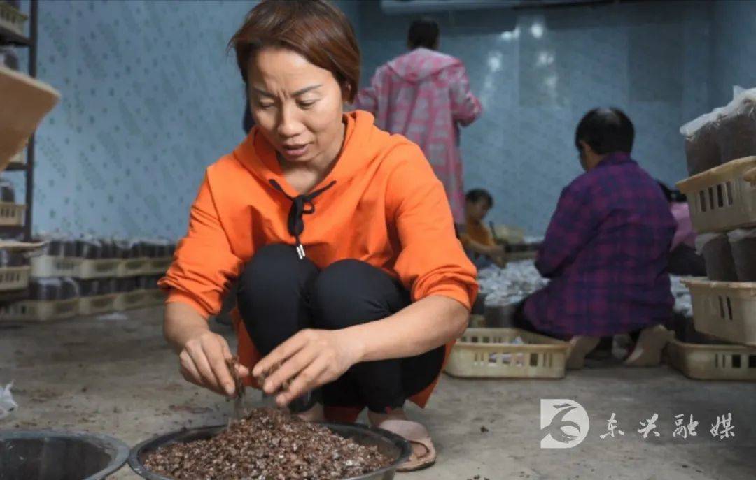 紧邻桑叶茶加工车间的,是公司的桑枝食用菌种植大棚与冷库。在冷库中,村民们正忙碌地将平菇菌种均匀拌入菌包培养基,经过精心搅拌后,菌种将在菌包内萌发形成菌丝。