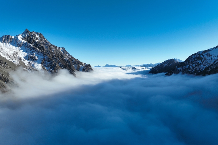 当无人机越过云层,阳光和蓝天骤然显现,山峰穿过云层,身上的积雪在阳光照耀下分外妖娆。由于云雾一直延伸到谷口方向,无边无际,没有散去的迹象,三人不得不原路返程。