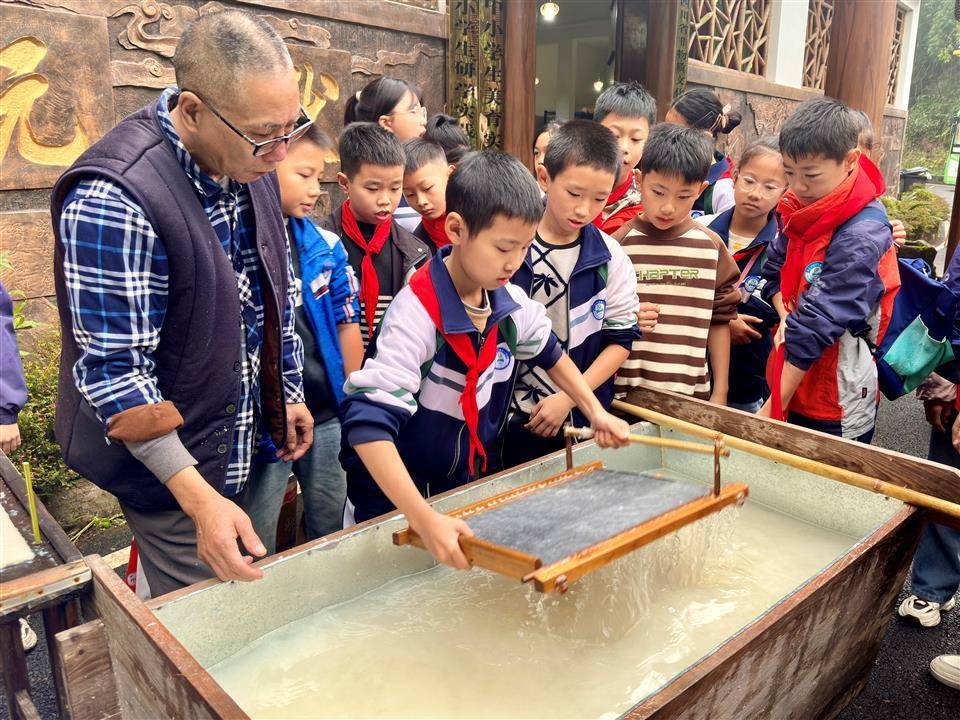 11月13日上午,马村镇状元纸坊(状元书画纸厂)内童声朗朗,来自甘江镇第一小学校的四百余名师生在此进行手工纸技艺体验研学活动,孩子们亲自上手操作造纸,体验非遗文化魅力。甘江镇第一小学校政教主任李雷佳告诉记者,学校每年都会组织学生前来开展不同主题的研学活动,让孩子们感受家乡的传统文化魅力。