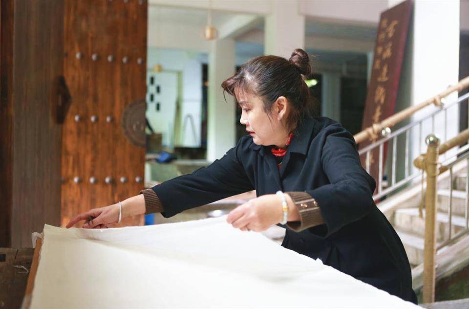 状元纸坊创始人杨占尧为国家级非物质文化遗产竹纸制作技艺传承人,1993年,陈秀君师从杨占尧学习造纸技艺,成为杨家手工造纸的第十三代传人。经过十几年的学习摸索,她对造纸技艺掌握娴熟,尤其对钳纸、刷纸、整纸等技术非常精通。今年8月,陈秀君入选为第六批国家级非物质文化遗产代表性传承人。