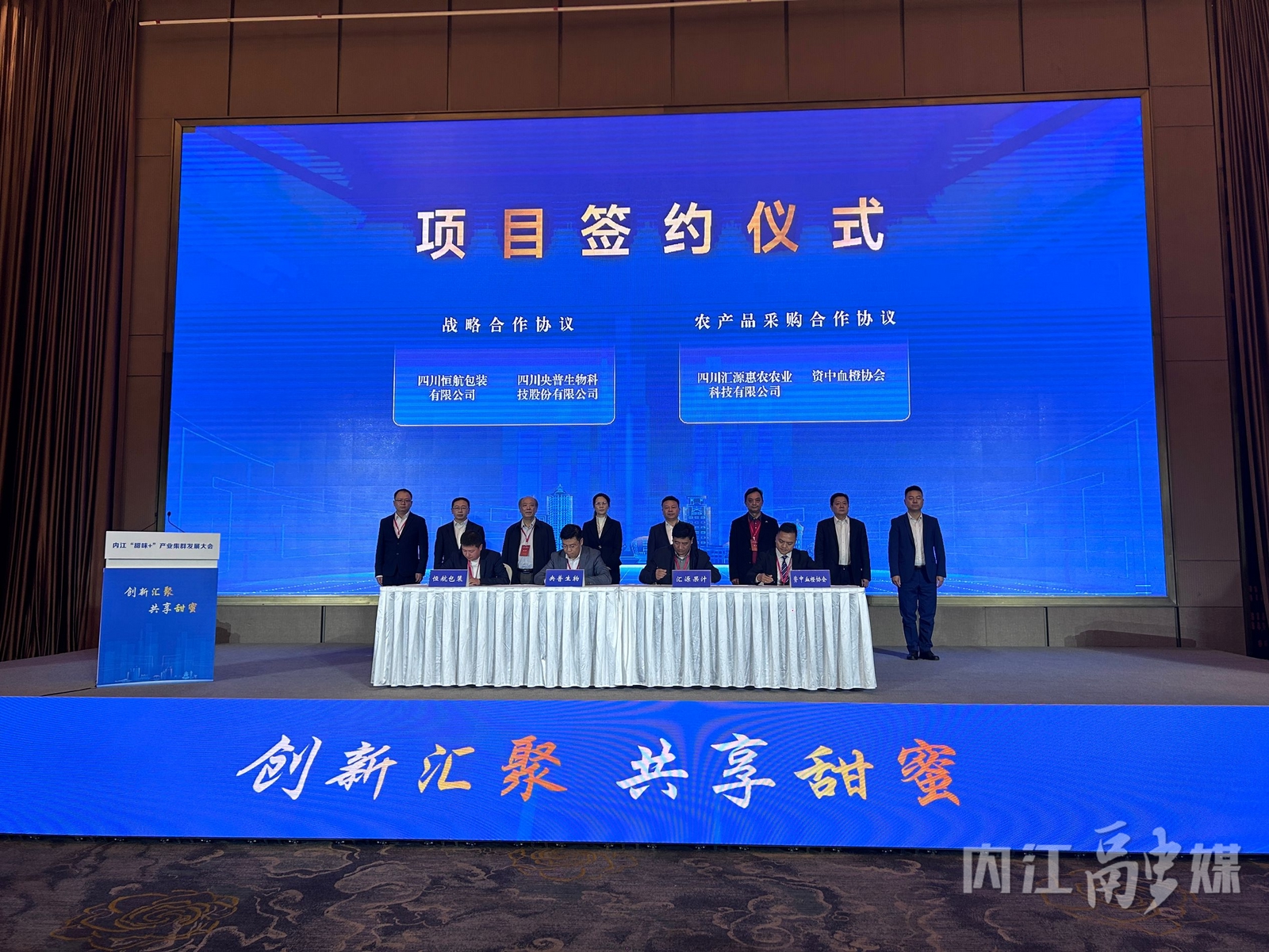 11月15日,2024内江“甜味+”产业集群发展大会上,四川汇源惠农农业科技有限公司与资中血橙协会签订农产品采购战略合作协议,四川央普生物科技股份有限公司与重庆市恒航包装股份有限公司签订合作协议。签约各方将凭借各自在行业领域的技术、资源、渠道、产品等优势,进一步深化“甜味+”产业合作,实现资源共享、互利共赢。