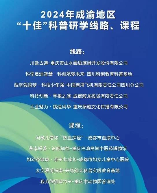 近年来,成渝两地的科普基地在科普能力提升、科普活动策划开展等方面深耕细作,创新性地开展了一系列科普工作,各具特色,并取得了较好的成效。活动现场对2024年成渝地区“十佳”科普研学线路、课程、基(营)地和导师进行了授牌。其中,“十佳”科普研学线路和课程包括川盐古道、科学启迪智慧·科创筑梦未来,我为熊猫摘竹子等;“十佳”科普研学基(营)地和导师包括成都博物馆、成都川菜博物馆,重庆师范大学的付文博等。