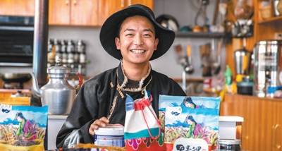 四川省甘孜藏族自治州甲洼镇,当地青年在展示直播售卖的商品。越来越多年轻人扎根家乡,为川藏公路沿线发展注入活力。新华社记者 储加音摄