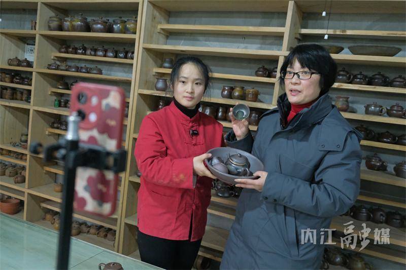 1月17日,内江市隆昌市圣灯镇梨园村利民土陶加工坊,在隆昌农商行东区支行工作的郑常兰正在手机前与网友们互动。