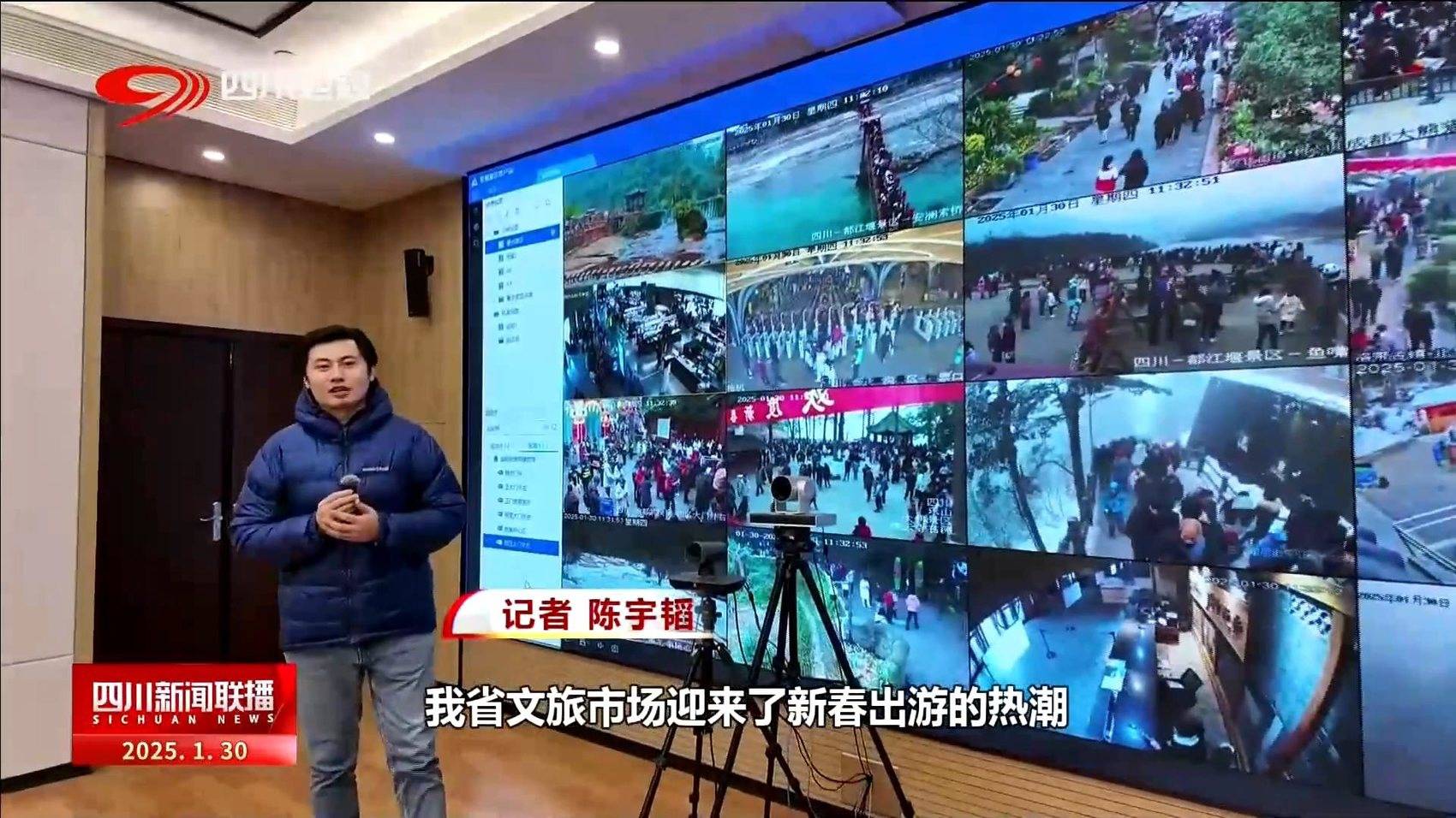 记者 陈宇韬:春节假期进入到第三天,我省文旅市场迎来了新春出游的热潮。我现在是四川省文化和旅游厅,通过我身后的智游天府平台大家可以看到,像都江堰、大熊猫基地、人间仙境九寨沟和客家古镇洛带等热门景区都吸引了大批游客前来游览。