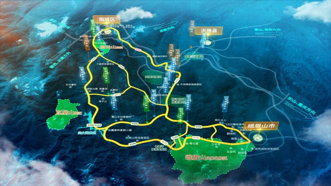 大峨眉“三山旅游环线”以串联“佛国仙山”峨眉山、“最美桌山”瓦屋山、“文化名山”周公山三座名山而命名,地跨乐山、眉山、雅安三市,由G351、S104、X084等多条普通公路组成,总里程约333公里。沿线旅游资源优质丰富,不仅有世界级文旅资源“峨眉山—乐山大佛”、还有中国森林氧吧瓦屋山以及周公山、柳江古镇、七里坪等旅游度假区。