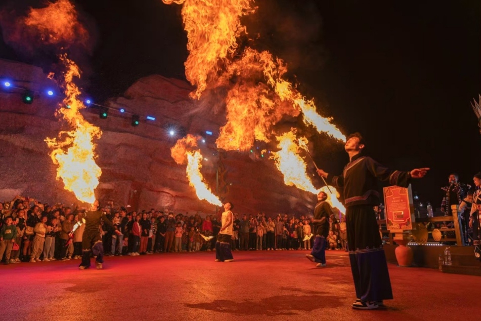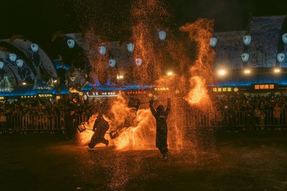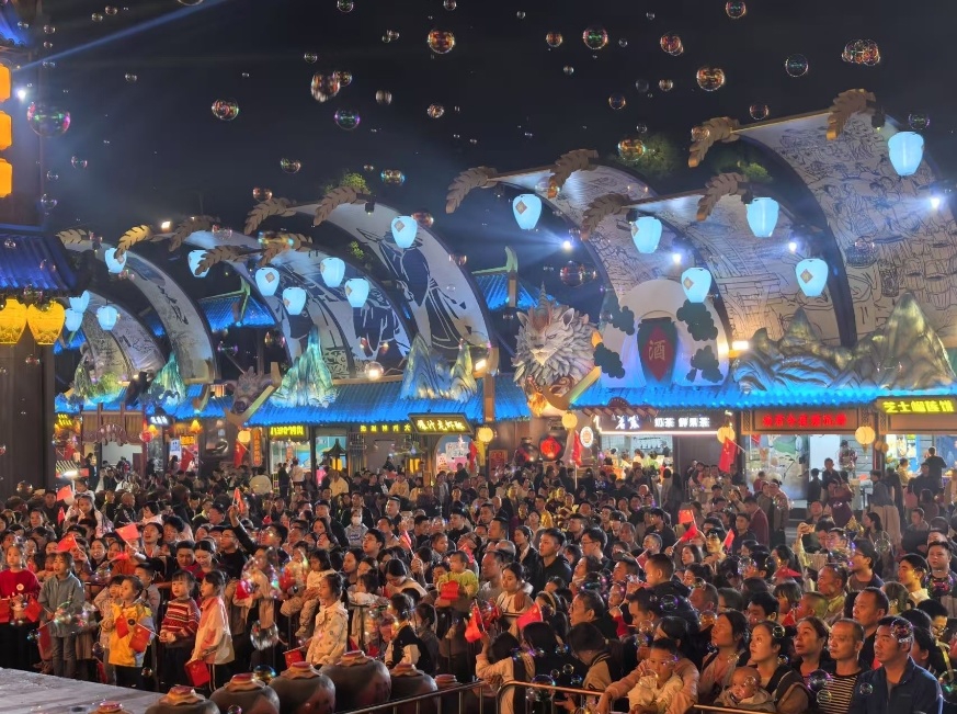 在泸州山河明月·醉酒城,以酒文化为核心的文旅融合新型夜间消费场景,融合了泸州酒文化、人文风情、民俗文化以及非遗传承等多元要素,现场还推出了青蛇大巡游、蛇年不倒翁、灵蛇竹舞、篝火狂欢等20余个循环展演节目,冰雪大世界、非遗火壶表演等环节一站式打卡。