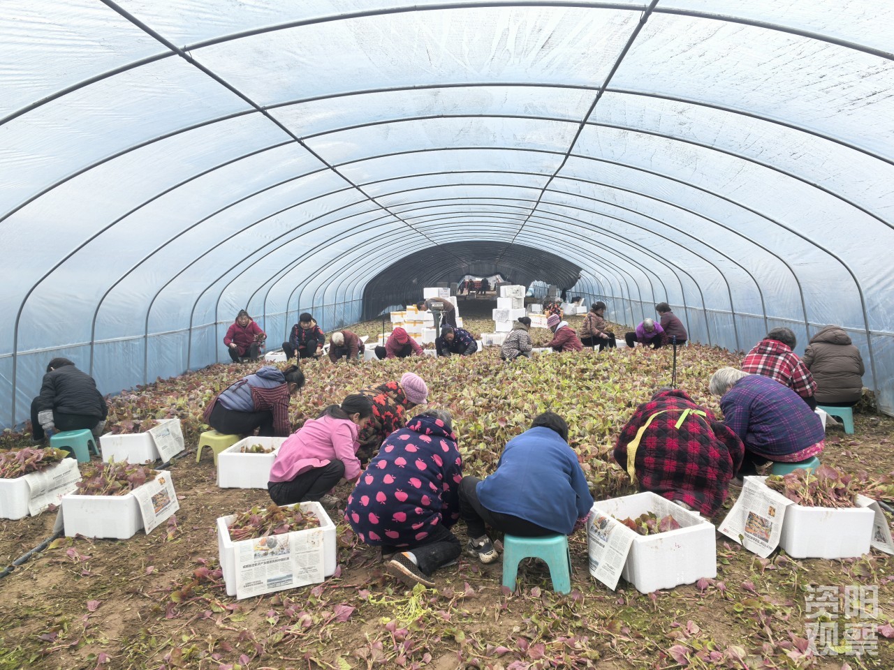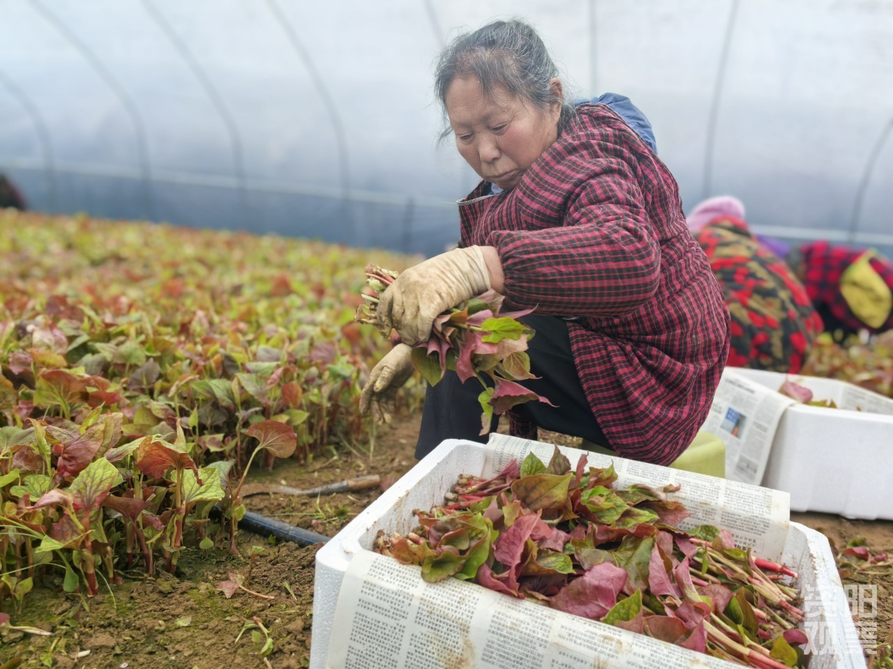 “动作要搞快点,轻拿轻放。”“叶子要嫩的,太老的不要”……2月11日,记者走进雁江区老君粮蔬产业园的折耳根基地,田野间折耳根一垄连着一垄,还未走进折耳根大棚,一股独特的清香扑面而来。大棚内,蛰伏了一个冬天的折耳根早已破土而出,浅红的叶片上还带着露珠,工人们熟练地挥动镰刀,起落之间,折耳根叶子被割落下来,整齐码放在泡沫箱中。