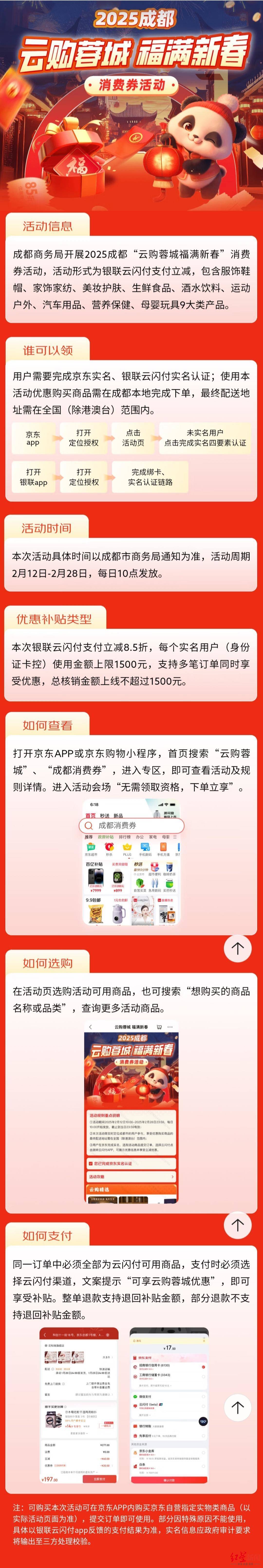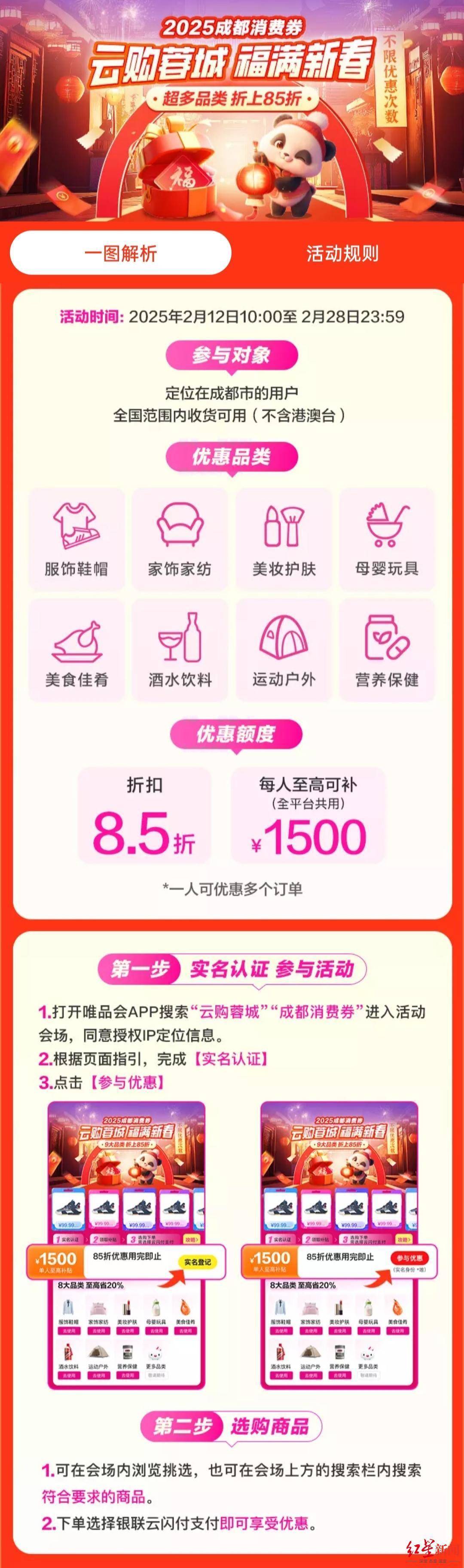 2025成都“云购蓉城 福满新春”消费券活动于2月12日10点在京东APP、唯品会APP同步开启,活动涵盖服饰鞋帽、家饰家纺、美妆护肤等9大品类。