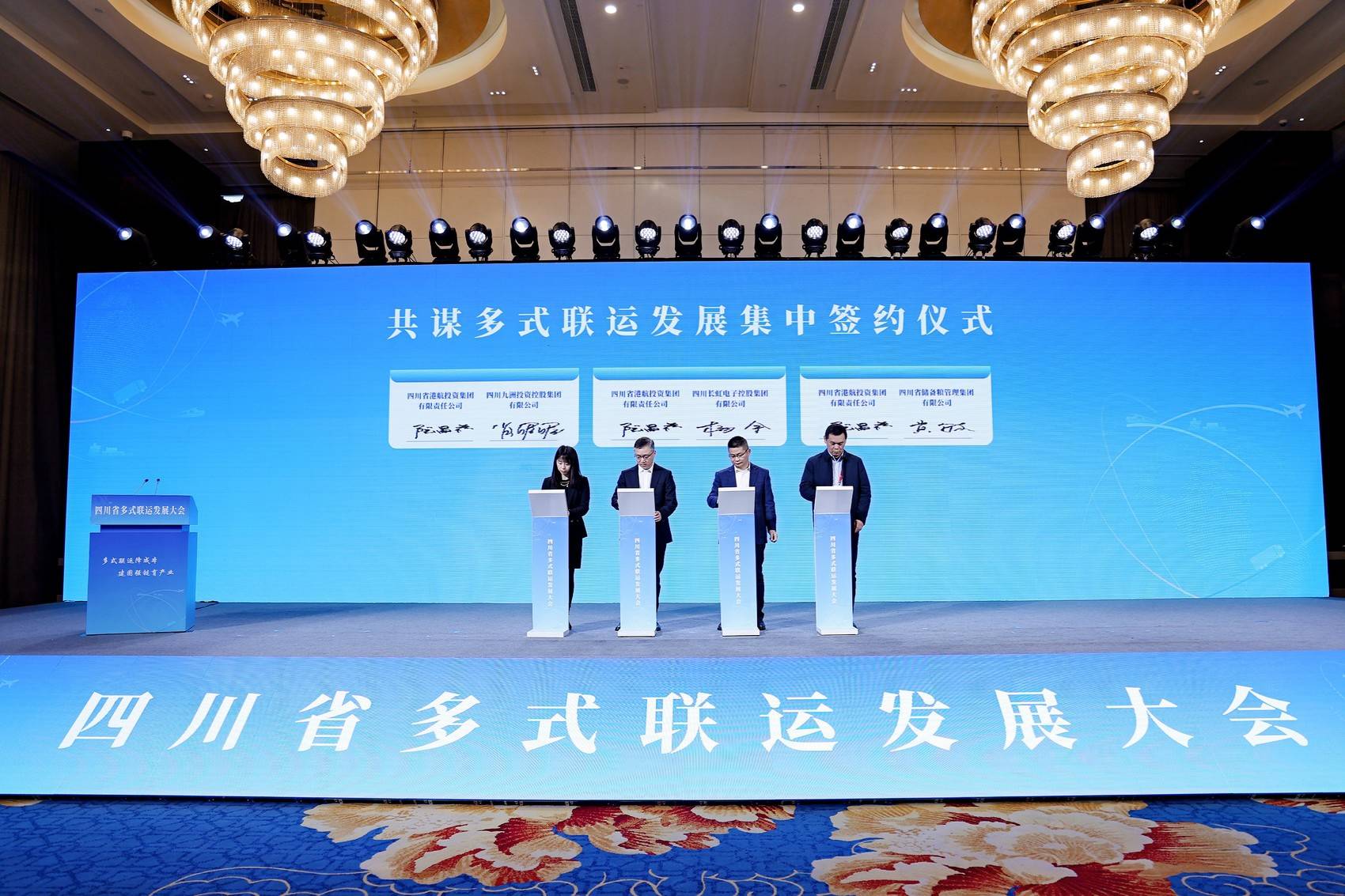 同时,大会现场还举行了共谋多式联运发展集中签约仪式。四川港投集团分别与四川长虹电子控股集团、四川九洲投资控股集团、四川省储备粮管理集团签订战略合作协议,同时四川港投数智物贸产业发展有限公司与成都、泸州、广元、南充、宜宾、达州、资阳等7个市(州)签订省市共建多式联运分平台战略合作协议,四川省陆海新通道发展有限公司与四川中远海运集装箱运输有限公司将共同推进多式联运“一单制”,共同布局海外服务体系。