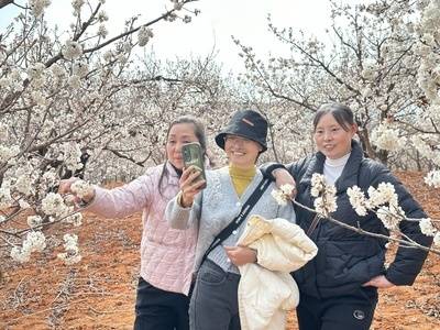 这里的樱桃花花团锦簇,花姿烂漫,以其素雅淡洁之姿点缀在枝头,宛如初雪般梦幻,具有极高观赏价值。漫步樱桃树林间,春风拂面,花枝摇曳,春光无限。来自攀枝花的游客李洪英与同伴们一边欣赏樱桃花,一边拍视频,她说她要发抖音,把这里最美的风景传播出去,让更多人了解这里,打卡这里。“我们几个人都约好了,这次看完了樱桃花之后,等过段时间这里的樱桃成熟了,我们还要来摘樱桃。”李洪英开心地说。