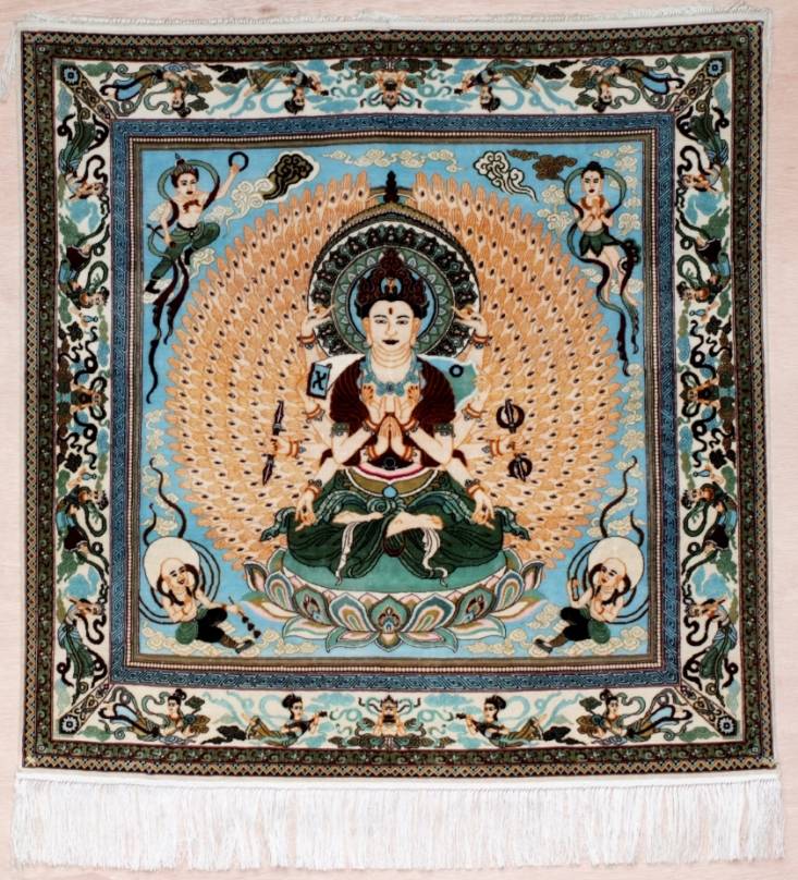 遂宁“观音绣”作为蜀绣的一种,源于安居区玉丰镇、横山镇。当地技人以蜀绣为基础,同时吸纳其他名绣精髓并融入遂宁独具特色的观音文化元素,绣制各种观音、莲花、荷包、蒲团、佛枕、方巾等寄托爱情、平安、福寿康年等美好寓意。观音绣法有晕针、木针、铺针、滚针、截针、掺针、沙针、盖针等,其特点绒片平滑、绣品细腻、浑厚圆润、灵动美观。
