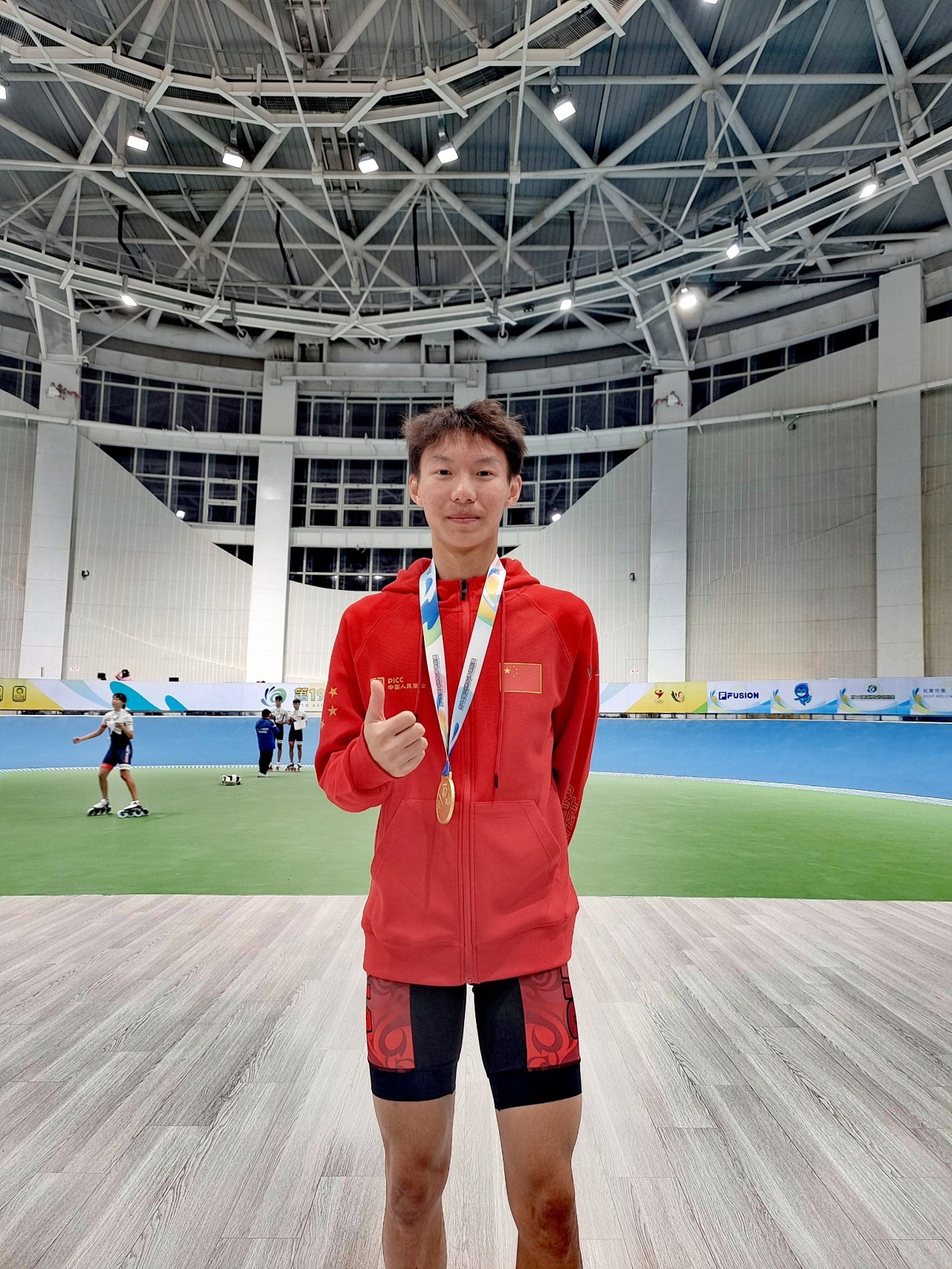 赛场上,这位已有14年训练经验的“老将”展现出超群实力:面对强敌,他凭借冷静判断与精湛技术,在1000米争先赛、10000米淘汰赛中两度摘金,5000米积分赛斩获银牌,一次次上演“速度与激情”,成为赛场焦点。中国轮滑协会顾问黄炜评价:“中国轮滑健儿正以强劲势头走向国际舞台。”