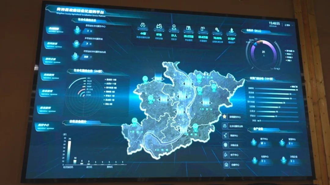 手机小程序上的数据也实时传输到青神县农业社会化服务平台。在青神县农业社会化服务中心调度室大屏上,全县农机设备、农机手、农资门店、烘干、育苗仓储等全产业链数据一目了然,还为农户提供了气象预警、政策解读、农技培训等信息。
