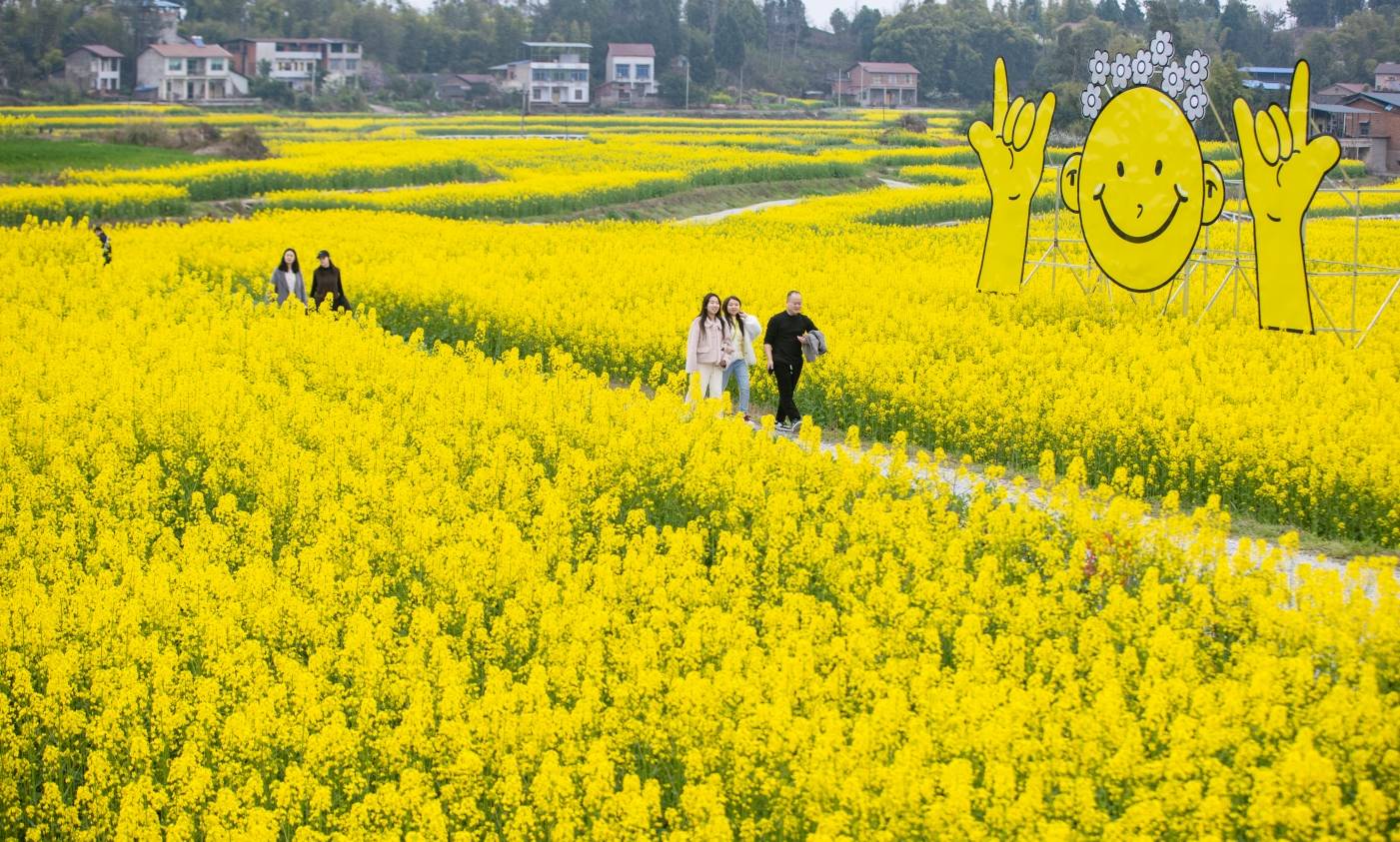跟随朱吉春的脚步,记者登上了该村的观景平台。站在平台上,向下俯瞰,只见连片绵延的农田里,上百亩油菜花开正盛,一片金黄,游客“点缀”其间。有的游客赏花拍照,有的游客围炉煮茶,尽情感受春天的气息。