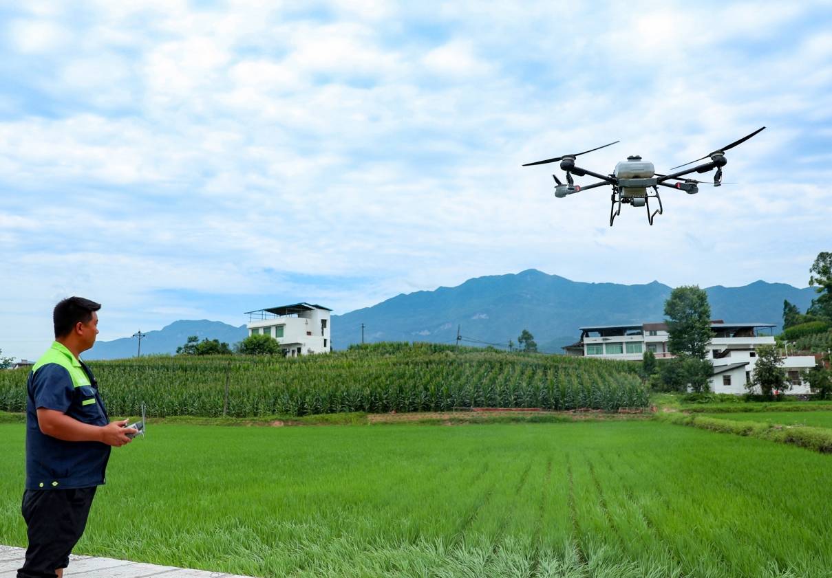 无人机“飞防”作业,护航水稻成长。(资料图 华蓥融媒 邱海鹰 摄)