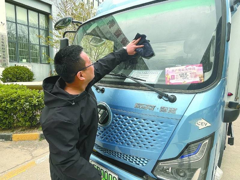于得宝擦拭的“党员先锋岗”货车。