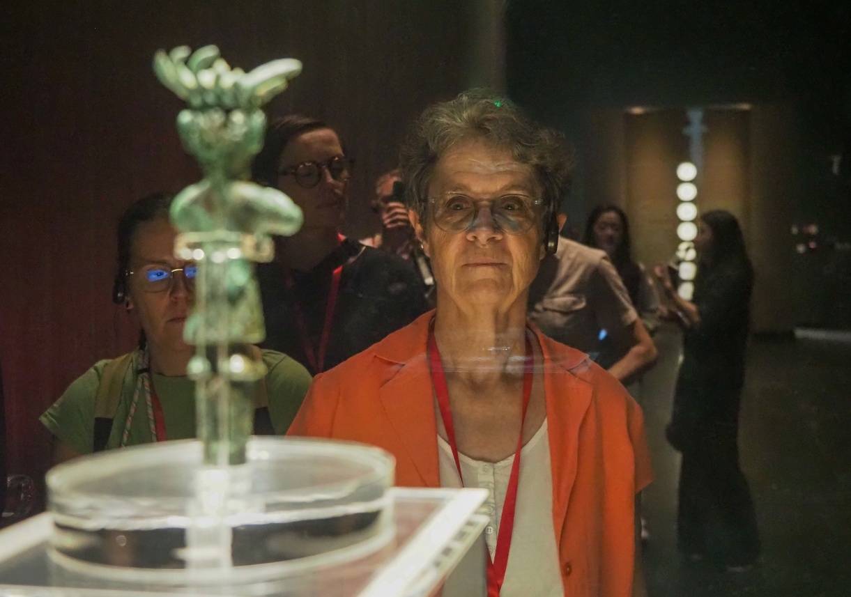 这里的文物展示方式令人震撼,游客能“穿越”遗址现场。“当灯光聚焦在青铜立人像的眼睛时,我仿佛看见古蜀祭司正在与我对视。”宜可城—地方可持续发展协会城市生物多样性中心主任英格丽德·库切说,回去要把太阳神鸟纹样推荐给大家。