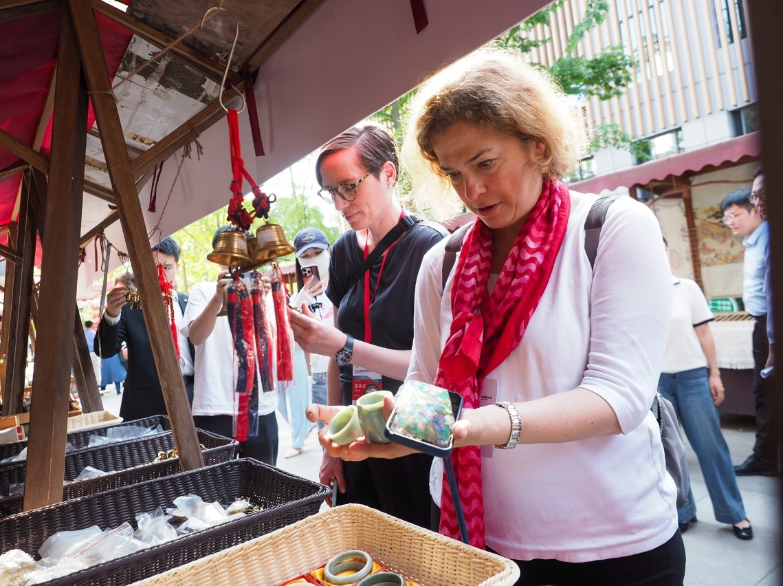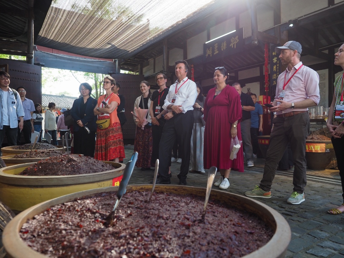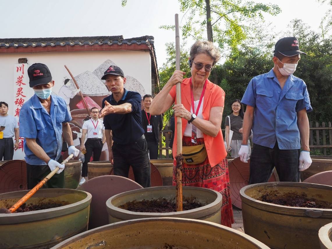 “搅拌豆瓣酱需要耐心,就像城市发展一样。”英格丽德·库切体验郫县豆瓣的翻晒工艺时说。郫县豆瓣作为四川特色美食,已成为当地标志性特产,也是战旗村的代表性产业。嘉宾一行来到这里,近距离观看制作过程,了解每一个工序的细节与精髓。