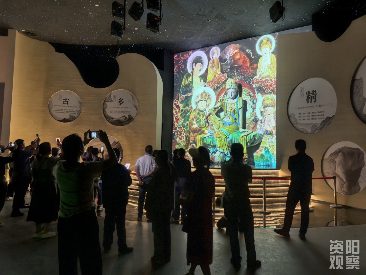 游客在“时光回溯”体感系统前比对手印,即可触发佛像“自述”前世今生;裸眼3D区的脑机设备,能将脑海中的佛像具象化呈现……在安岳石窟数字展示中心内,10万尊石刻在声光电技术中“复活”,无数游客与盛唐工匠来了一场“跨时空对话”。