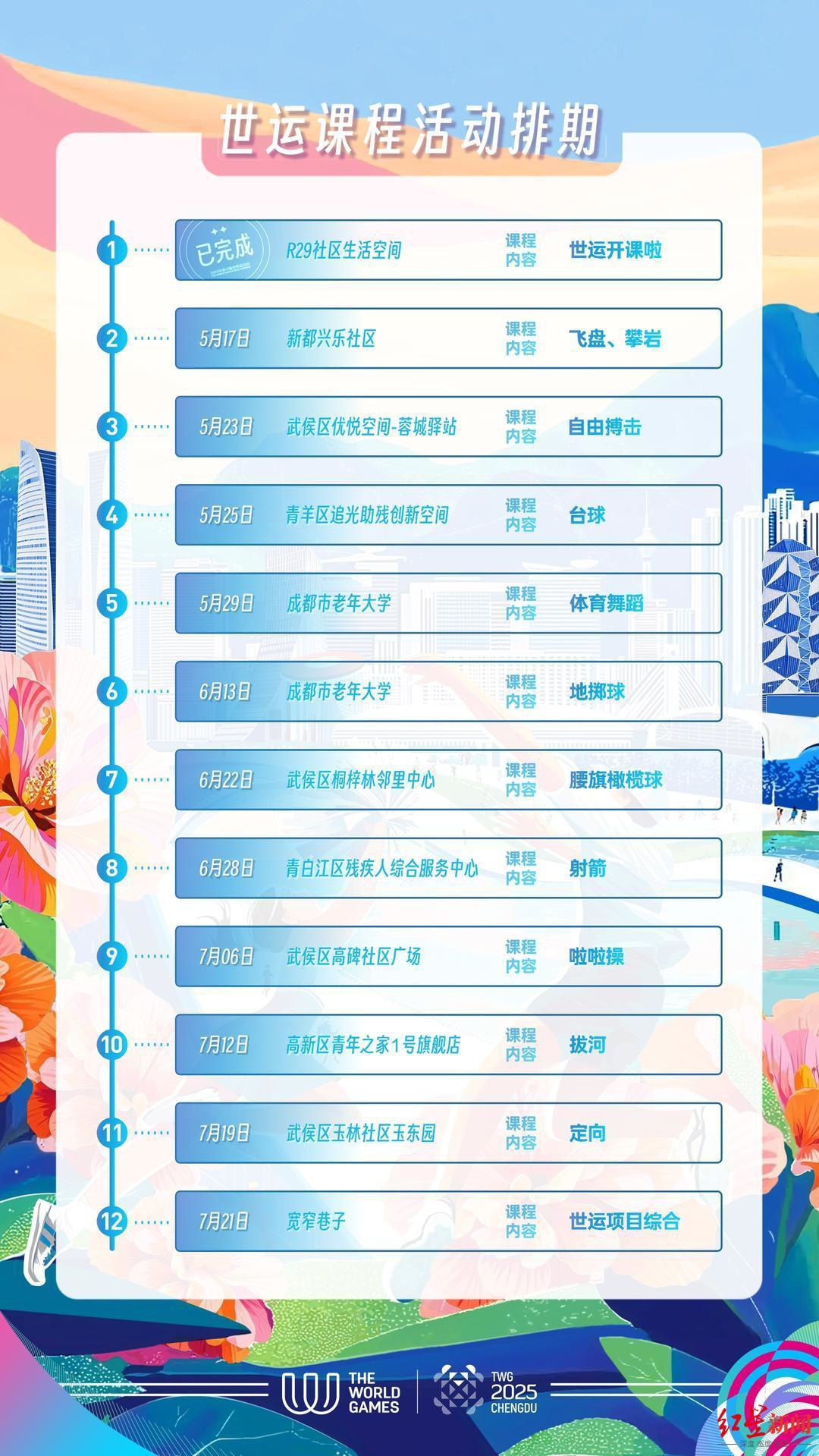 从今年5月到7月,将陆续推出11场主题课程活动,涵盖飞盘、自由搏击、体育舞蹈、啦啦操、腰旗橄榄球、地掷球、台球、拔河、定向、射箭等多个世运项目,通过沉浸式教学、趣味挑战、文化互动等形式,吸引青年群体、亲子家庭、老年群体、残障群体等多元群体参与。