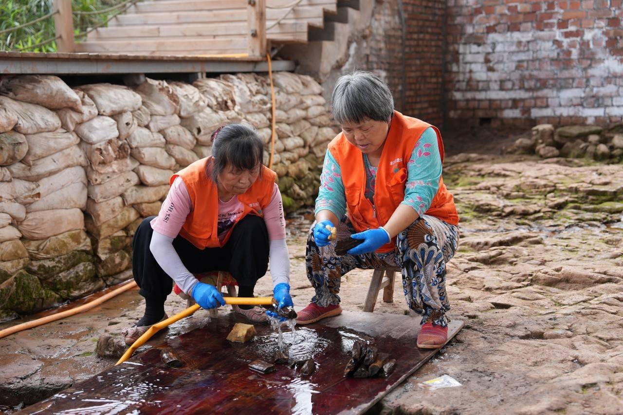 在洗土区,同为乐阳桥村村民的冷永桂和另一位村民坐在小板凳上,俯身清洗着数段乌木。她们面前摆着1桶水、3块泡沫海绵和3根不同粗细的竹签。
