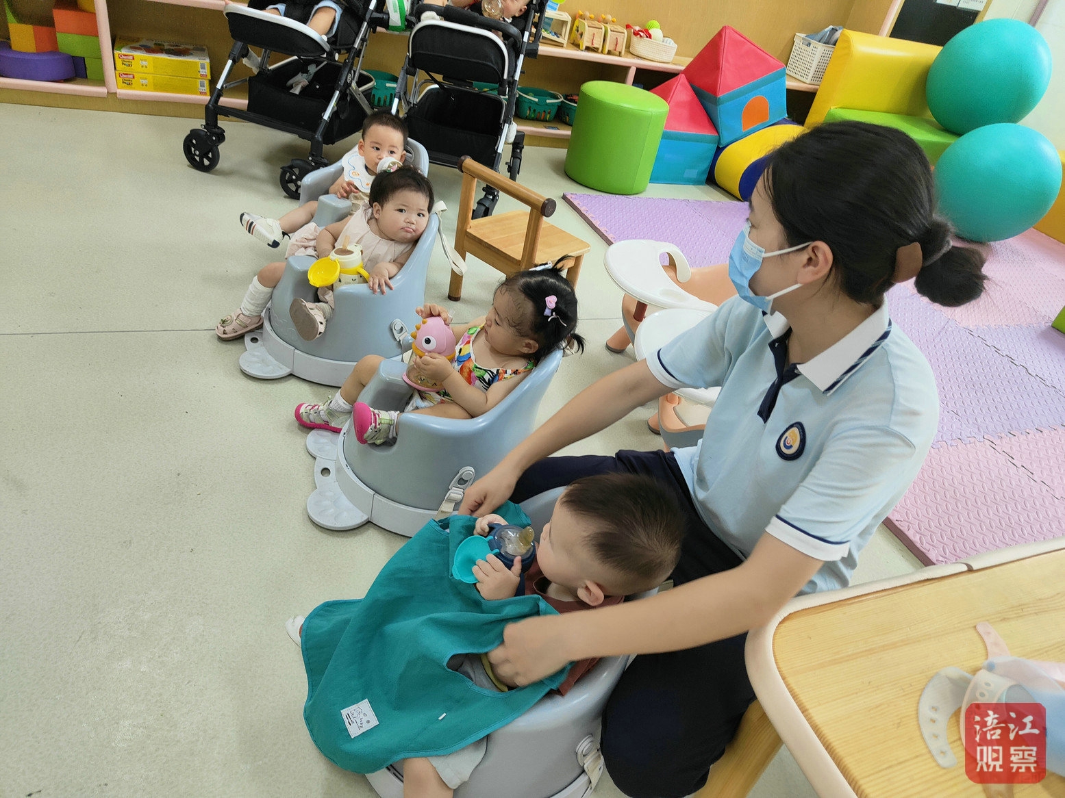 “来,该吃奶咯。”九月龄的月月坐在婴儿车里,在托育园老师的照顾下抱着奶瓶喝奶。楼上,一岁多的小朋友萌萌(化名)便便了,育婴师正在为其清洗,换上干净的纸尿裤和小裙子。