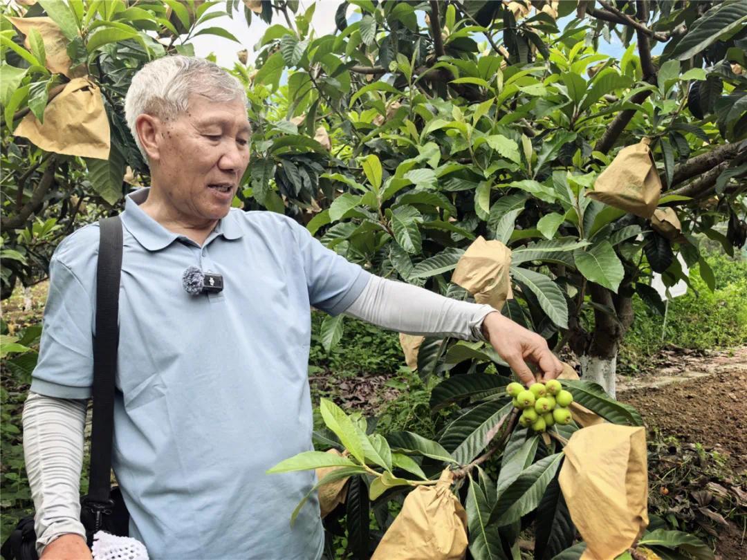 2025年6月6日,在石棉县丰乐乡的枇杷大观园,王永清轻抚一株挂满纸袋的枇杷树。这,正是在石棉培育出的能够躲过冻害的优质枇杷品种“春花1号”。