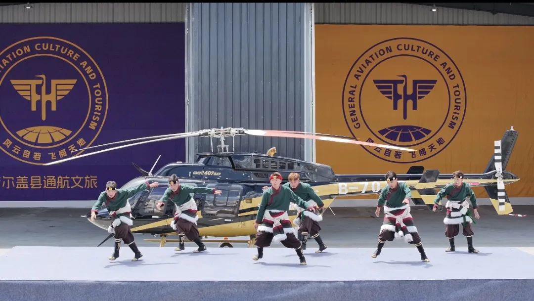 首飞仪式现场气氛热烈,身着传统服饰的演员们以热情洋溢的舞姿与高亢嘹亮的歌声,表达了对低空时代的祝愿和自豪,展现了若尔盖文化与现代发展融合的魅力。