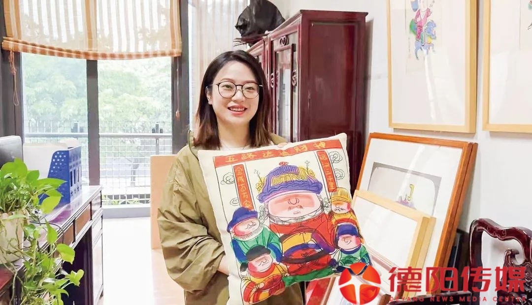 章昉展示自己创作的绵竹年画抱枕。德阳传媒记者 周梅 摄