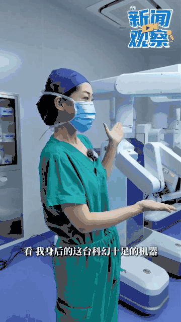 “看!我身后的这台科幻十足的机器就是腔镜手术机器人,接下来的时间,就交给它吧!”